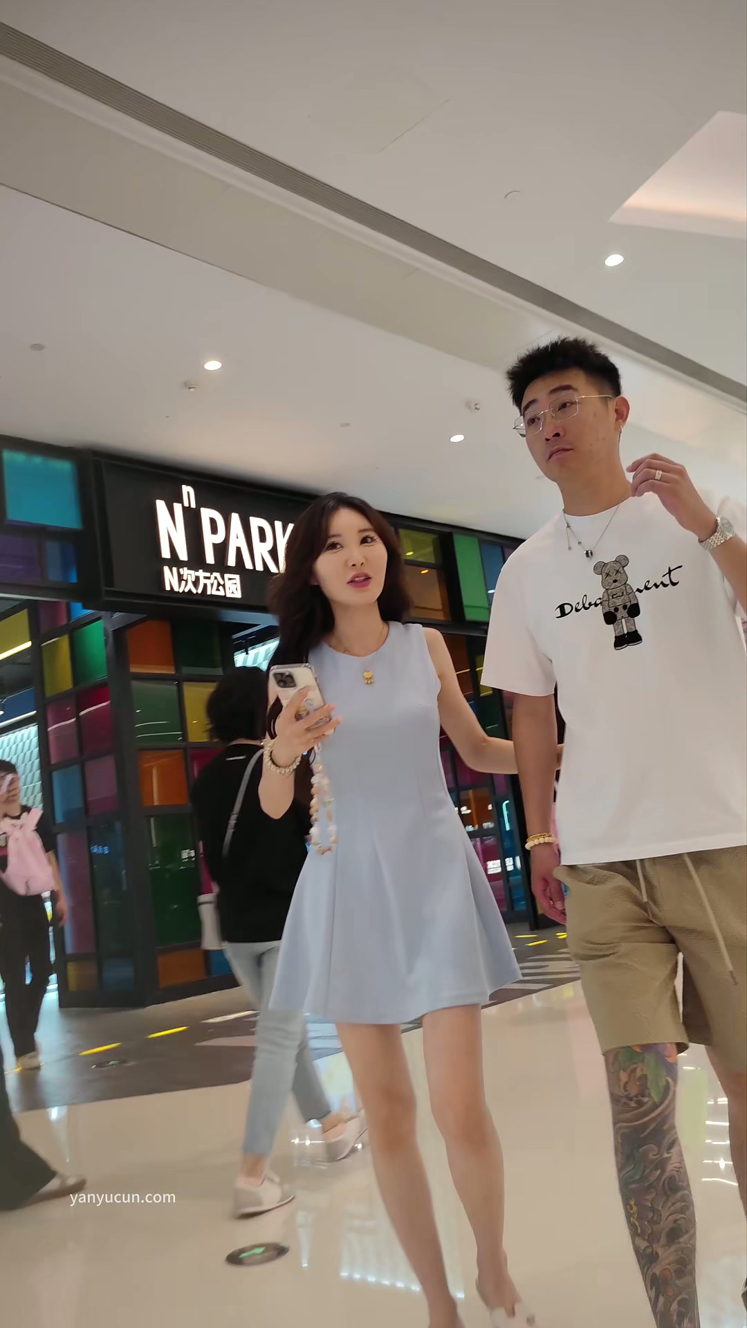 XM322蓝色连衣裙美女和男朋友逛街买衣服,白色窄内漏B边