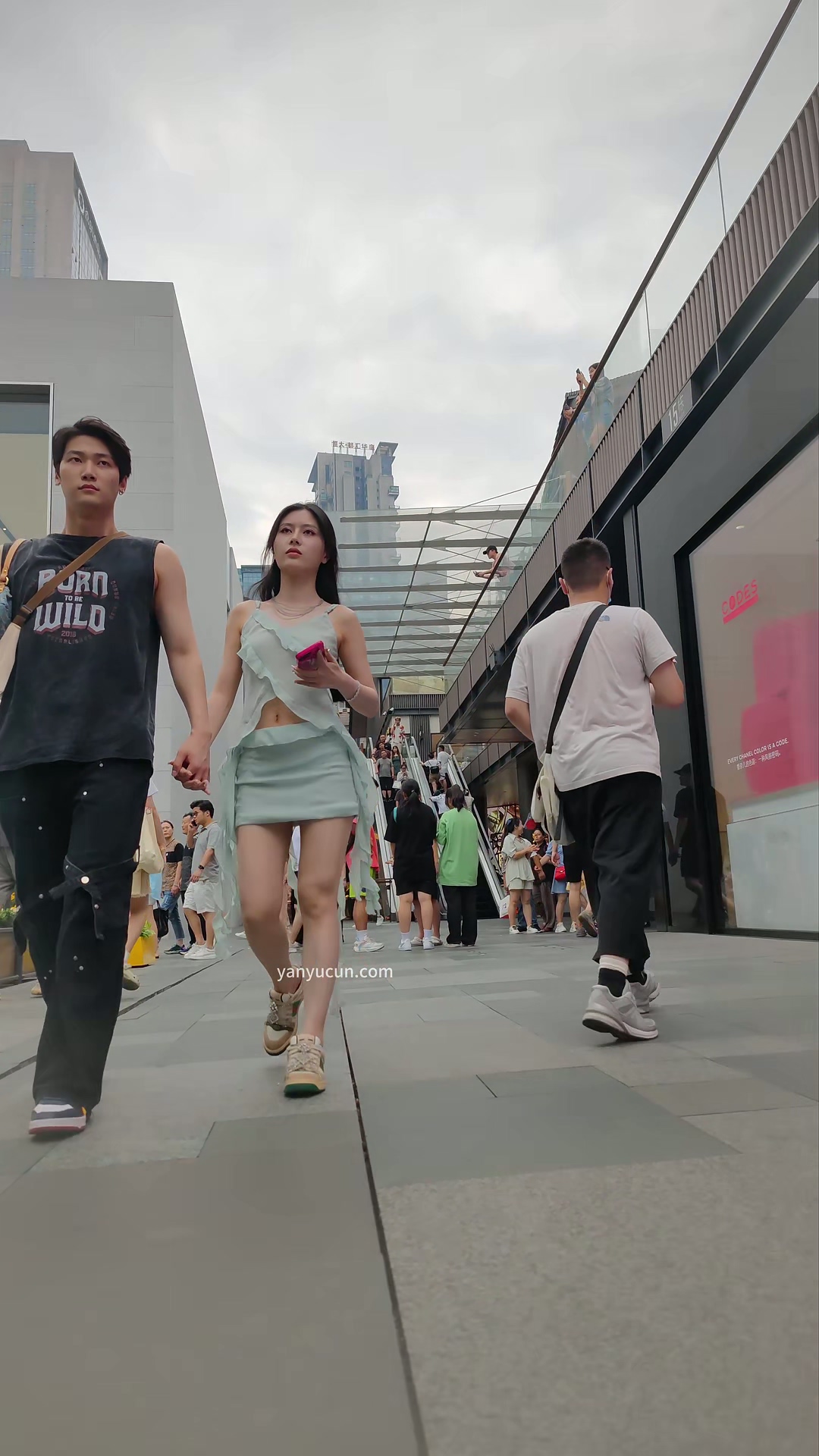XM330绿色蕾丝超短裙美女和男朋友逛街,粉色内内