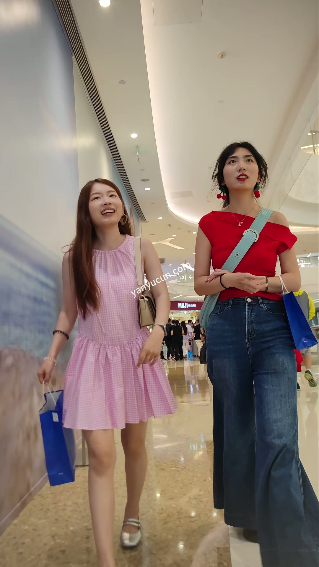 XM406粉色连衣裙小姐姐和闺蜜逛街买衣服,灰色内 ...