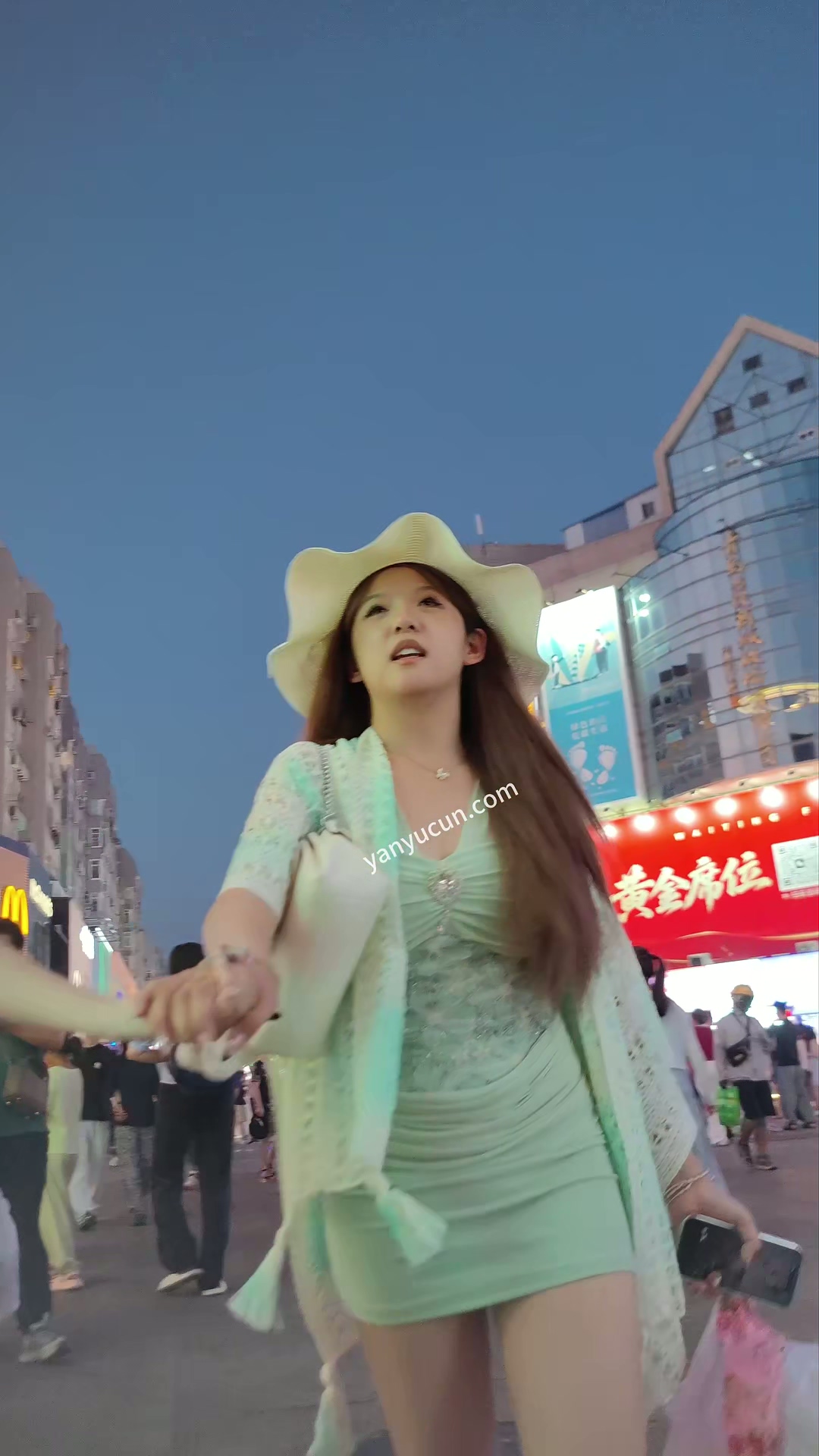 XM409绿色包臀裙小姐姐和朋友们逛夜市,蓝色内内 ...